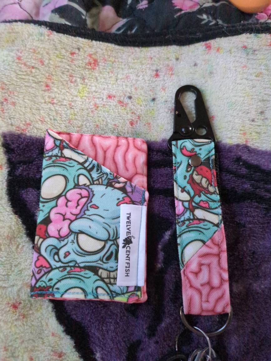 Carry your cash and cards in undead style with our Zombie Brains Print Minimalist Wallet! Handmade from recycled canvas, each wallet features a unique brain-print interior for a playful touch. Holds 4-8 cards for all necessary purchases. Brains not included. đŸ˜‰