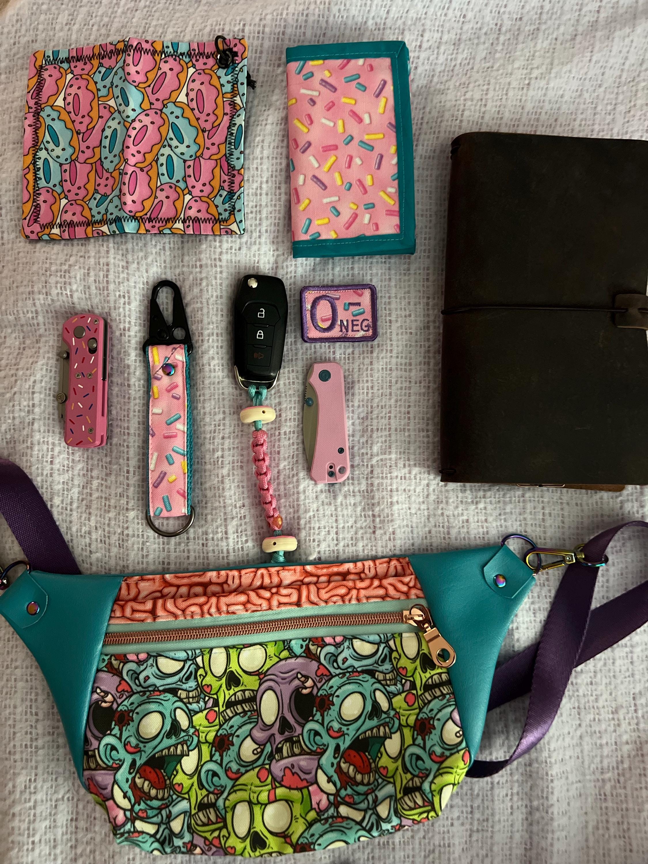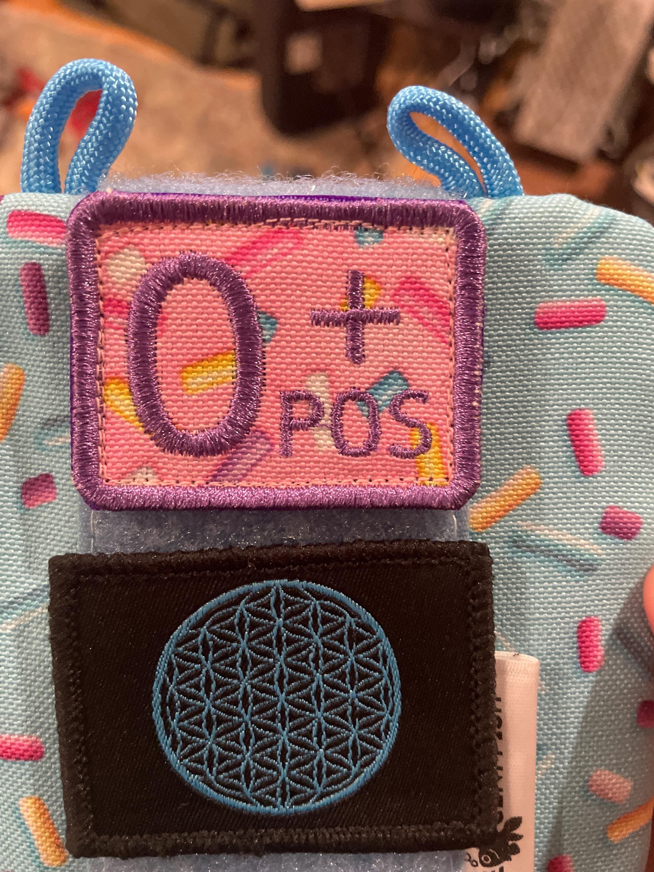 Handmade Embroidered Donut Sprinkles Blood Type Patch with hook backing for adding onto your favorite pouch, bag, hat, whatever - as long as it has the loop side for fastening.